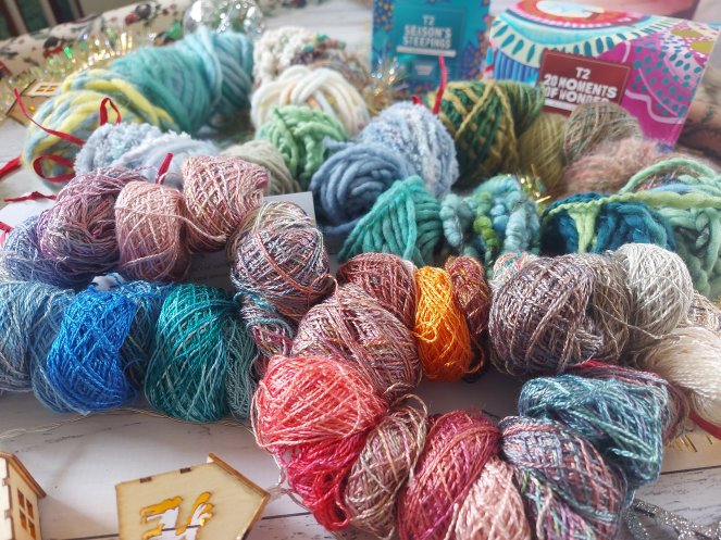 For this year I have developed a 24 day advent calendar to use up the ball remnants in my stash. The patterns are a mix of my own designs along with those I have planned to make. I wrap up little bundles of yarn and a packed of fancy tea for each day of December. Above is a selection of yarn I will be using on the patterns!
