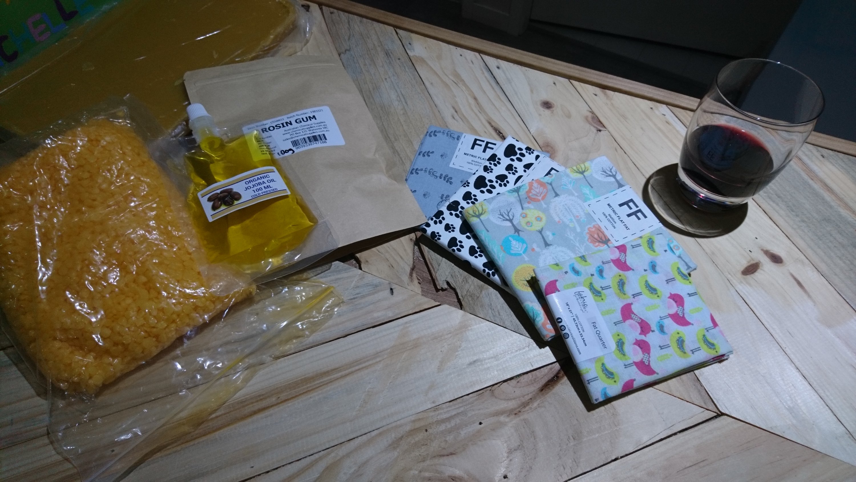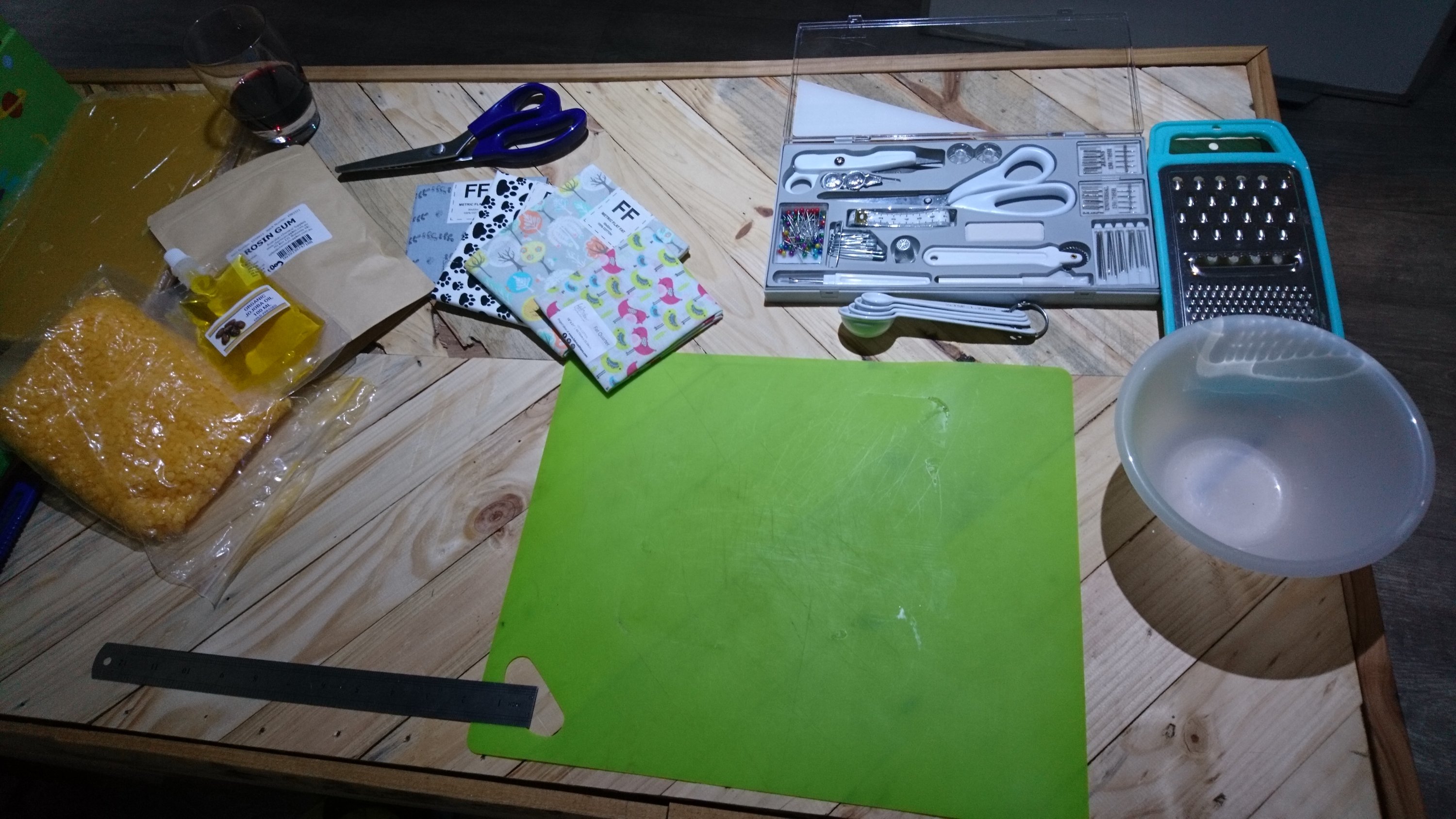 100% cotton squares cut into sizes, the other ingredients are listed below per size. Baking tray, Baking paper, Iron, double boiler with mason jar, oven.