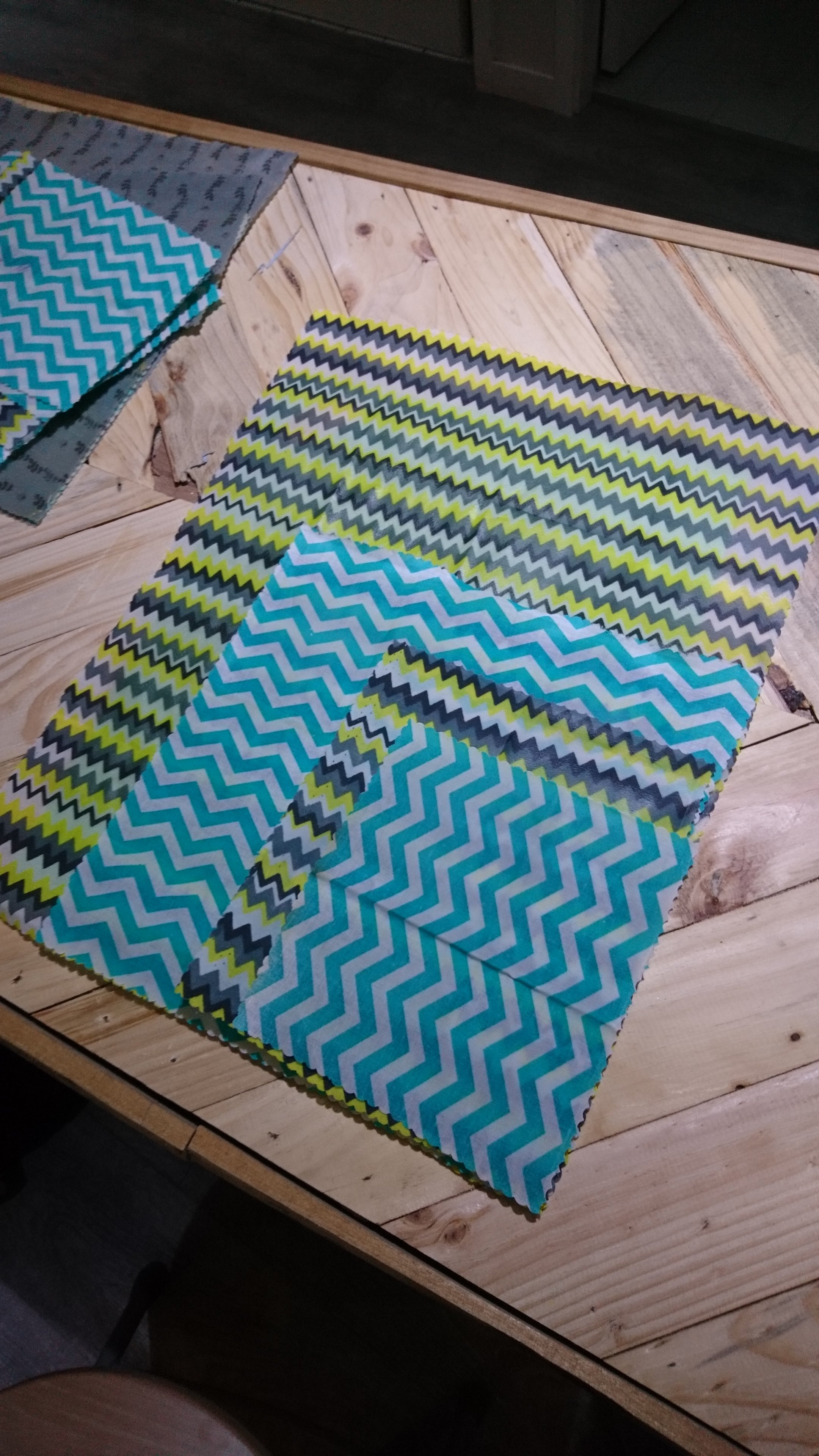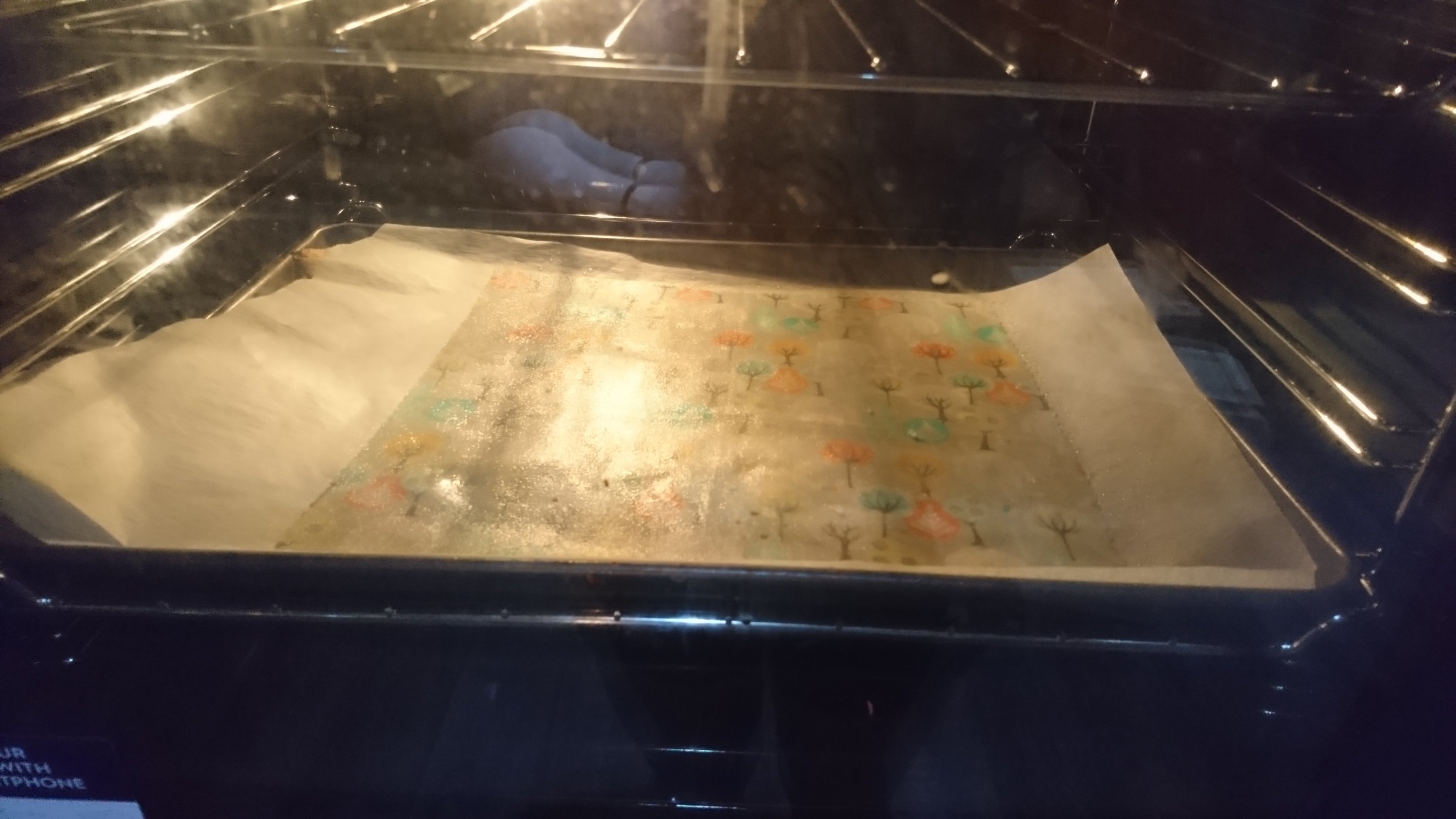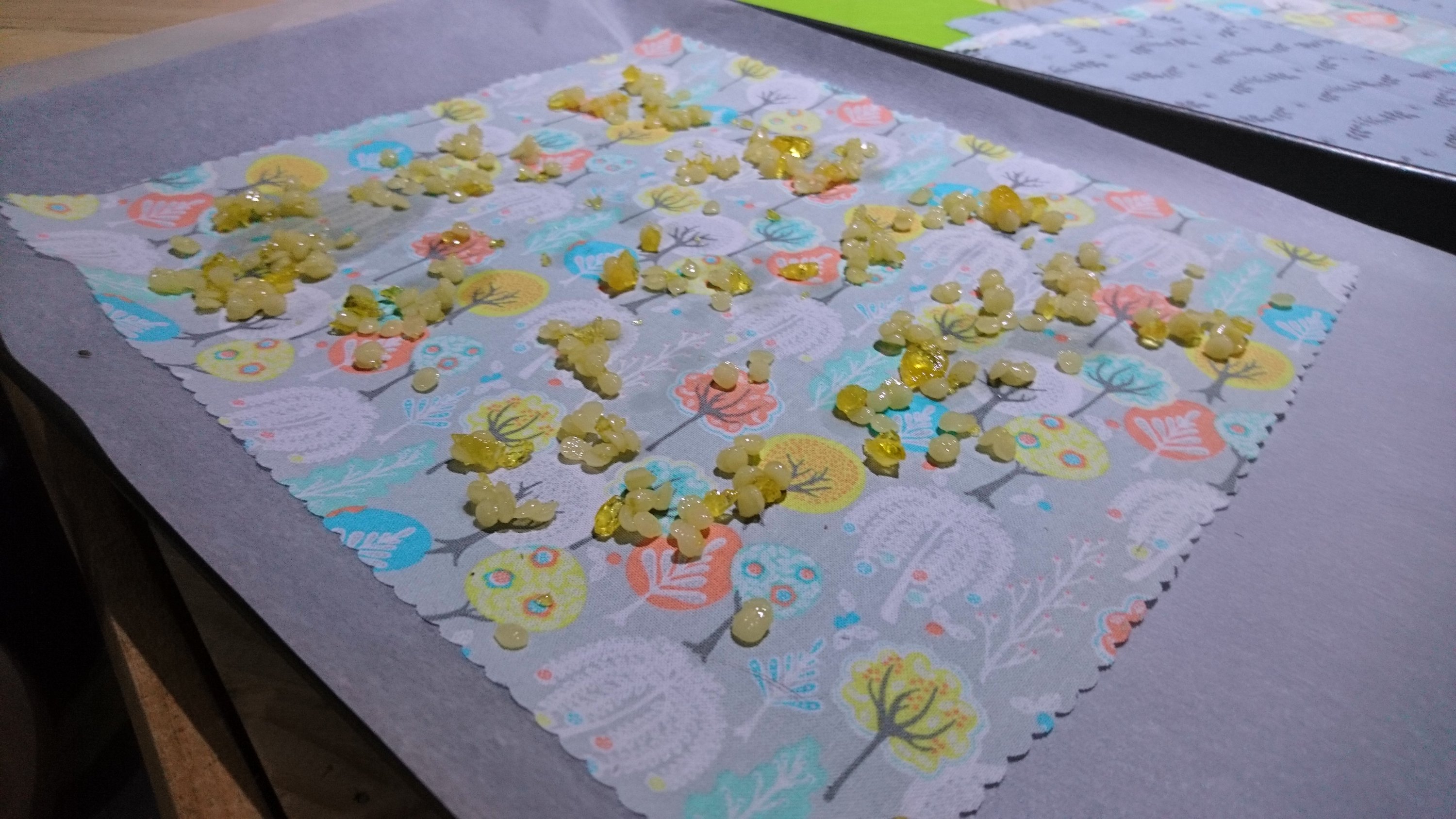 3. Once cotton is coated enough (personal choice here) you will need to iron the sheet to evenly spread the mix. Iron between two fresh sheets of baking paper. Once happy hand on a airier to dry. This will not take long.