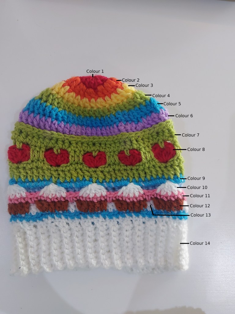 If you need to increase the number of rows in the rainbow flat circle section you have two options: add more shades to the rainbow, increase the smaller red/orange row repetitions as these are less noticeable under the pompom.