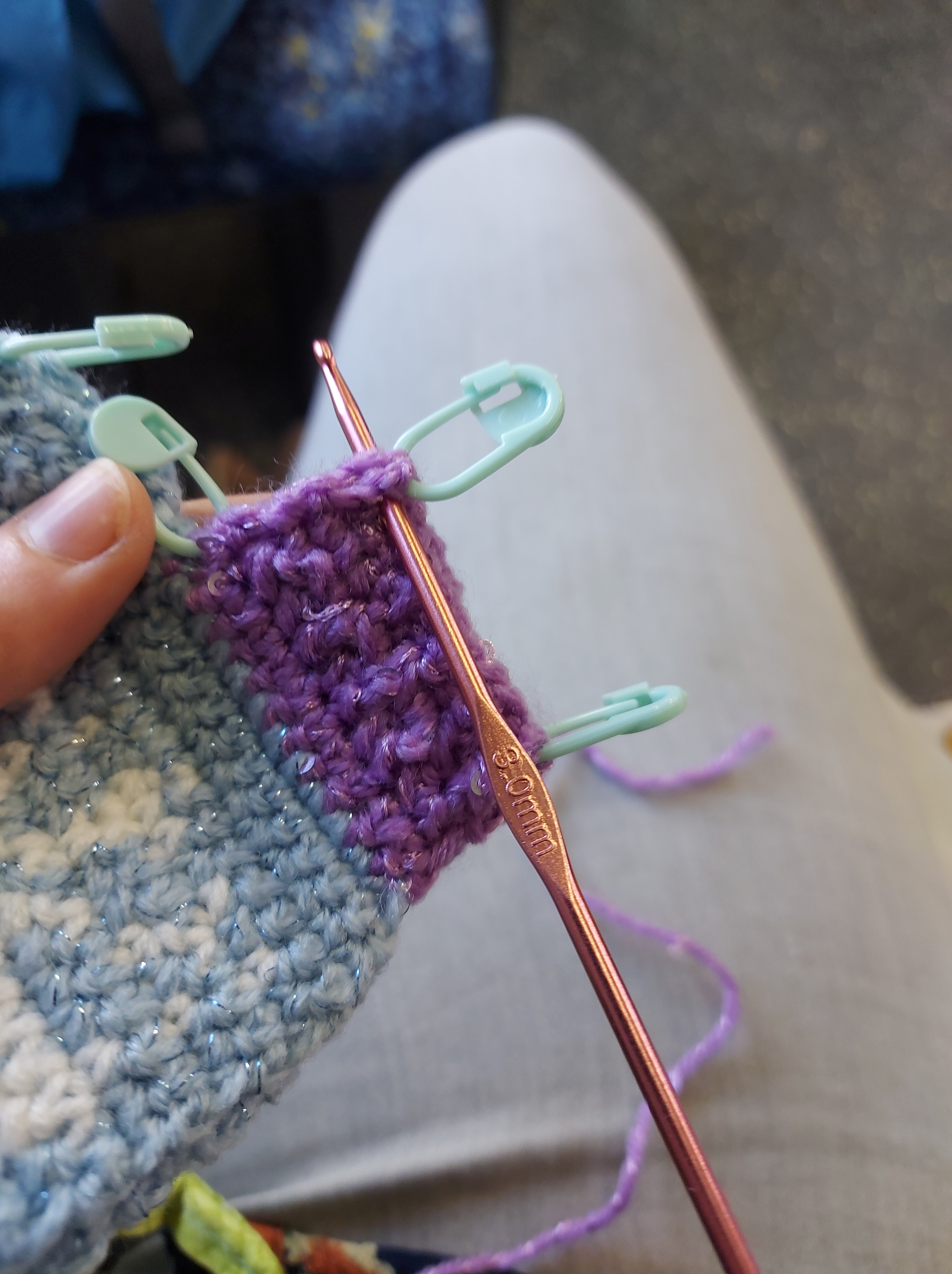 This is a blue and purple panel. Follow the basic pattern instructions for the back side. Rows 1-5 in purple and Rows 6-25 in blue.
