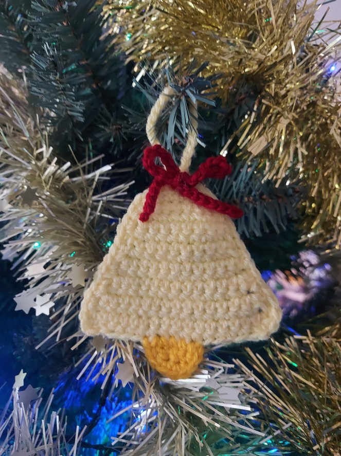 - Make a bow, CH46 in 2nd from the hook SC[DC], SC[DC across. Tie in a bow. Sew into the front side of the bell.