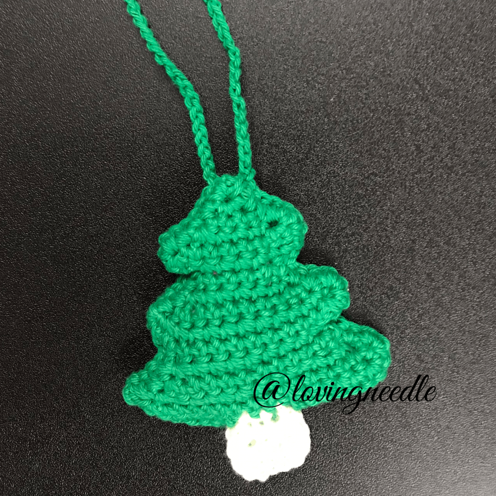 - Attach green yarn to the base of the tree trunk with a slip stitch. SC/DC through both layers around to top of the tree. Add 3 stitches in each corner. At R1. CH45, SL into R1 (Or desired loop length). SC/DC through both layers down to the trunk. Make 3 stitches in each corner.