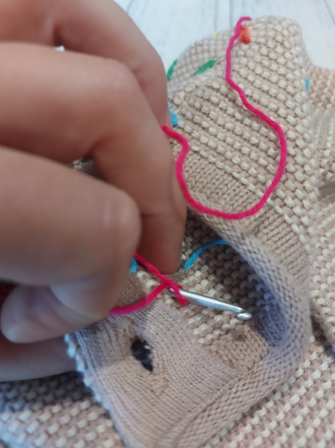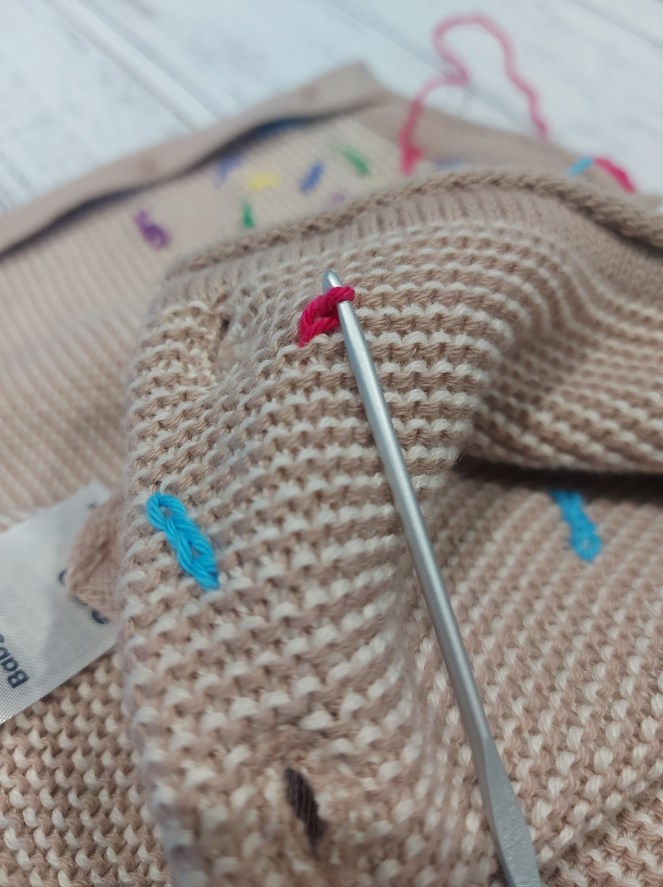 One of the lovley ladies in the community asked me how I would go about making a 100’s and 1000’s jumper. The idea was to modify one of her daughters exsting yarn jumpers from K-Mart and add the sprinkles through crochet. My first thought would be to go for a 3D effect with picots, however it would be very difficut to ewace in ends without the wrong side looking like a spiders web. The winning concept was to use surface slip stitch crochet to make indiidual sprinkles and sew in the loose ends. In this post I am going to desribe how to adjust your own yarn jumper and up-cycle it into a sprinkle jumper.