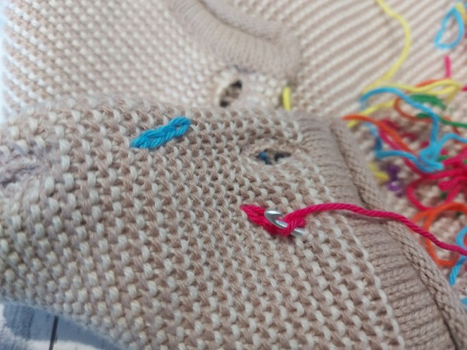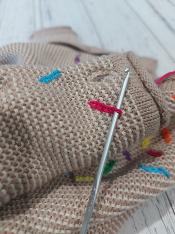 I went for a dipped doughnut effect with my trial of a jumper. I used several colours of yarn randomly scattered around the bottom 2 inches (5cm) of the jumper and sleeves. This used scrap ammounts of fine cotton. I would recomend embroidery floss cotton to do this with. I used 4ply remenants from a pervious cotton.